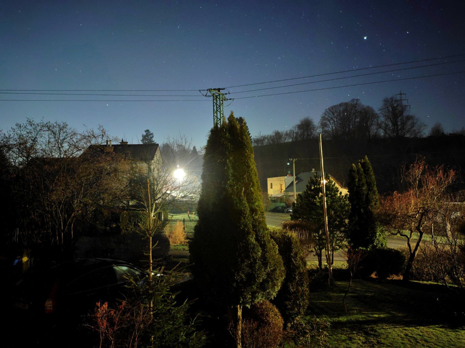 0,2°C, Jasno, Sníh: 0 cm. Trošku se oteplilo, ale už se stihl vytvořit přizemni mrazik, měsic ma teďka sílu no.