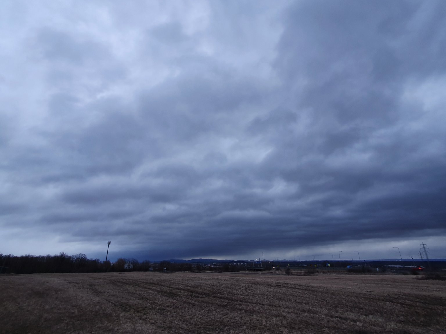 Zataženo, občasný déšť, čerstvý až silný Z vítr, tlak 1012 hPa.