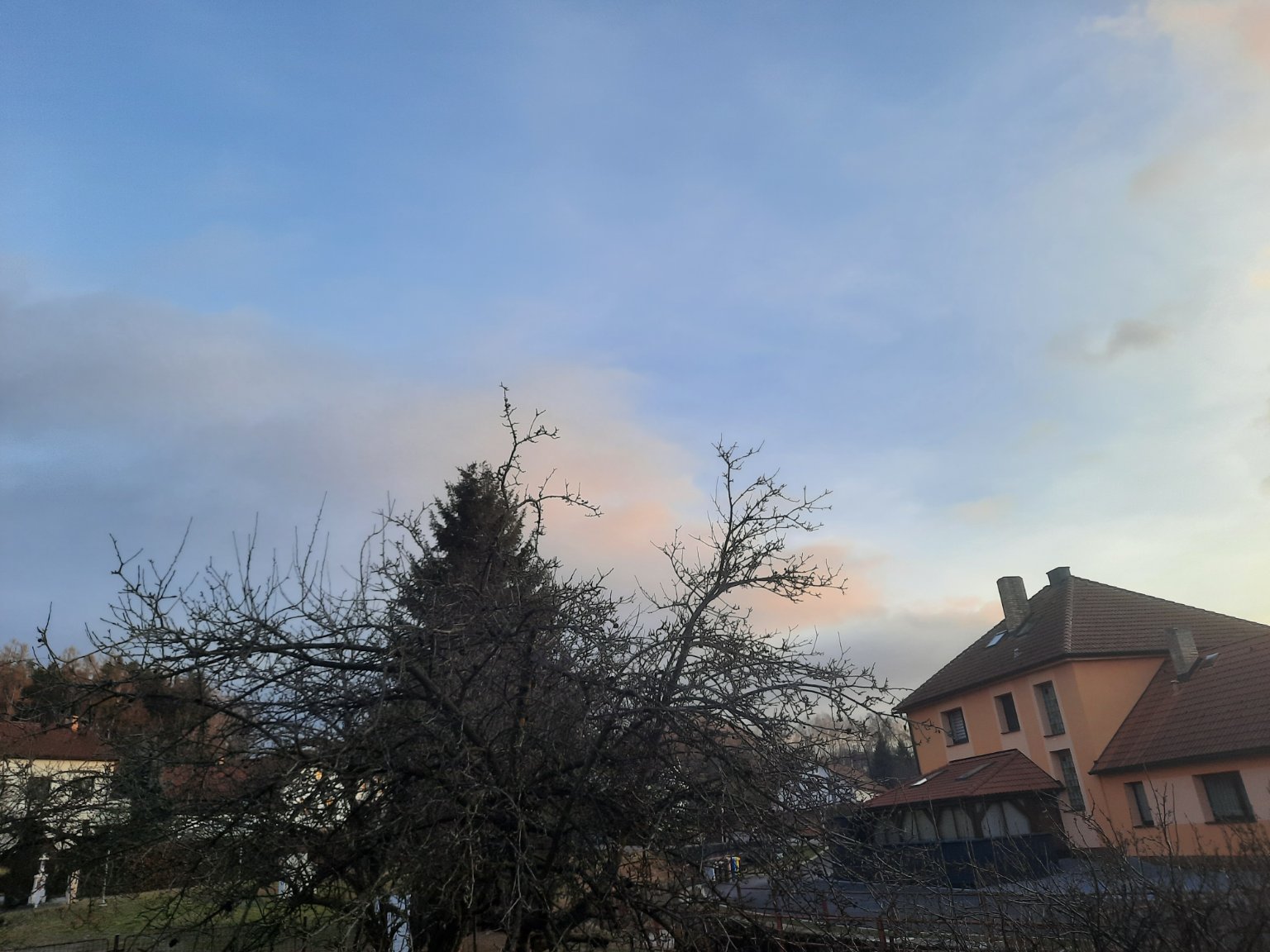 Ráno zachyceno ještě s miminem oblačnosti, barevný a hezký východ slunce, které je ještě za kopcem, nyní se již zatahuje. Velmi teplo.