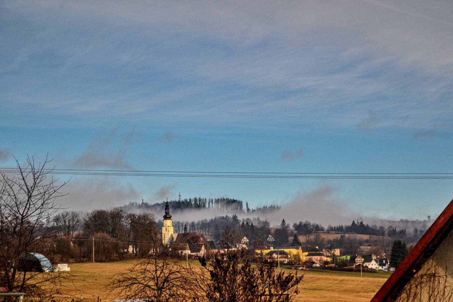 Mlha, klidno, tlak 1002 hPa.