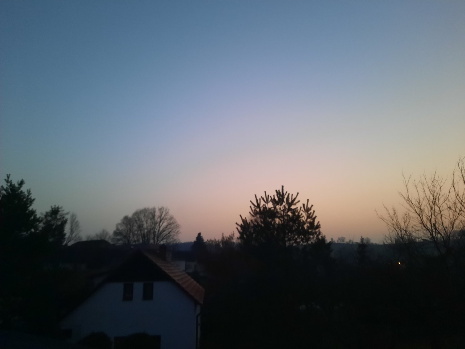 8,8°C, Skoro jasno, zanedbatelná mlha, Sníh: 0 cm. Fajny poslední zimní (Jarní) večer.