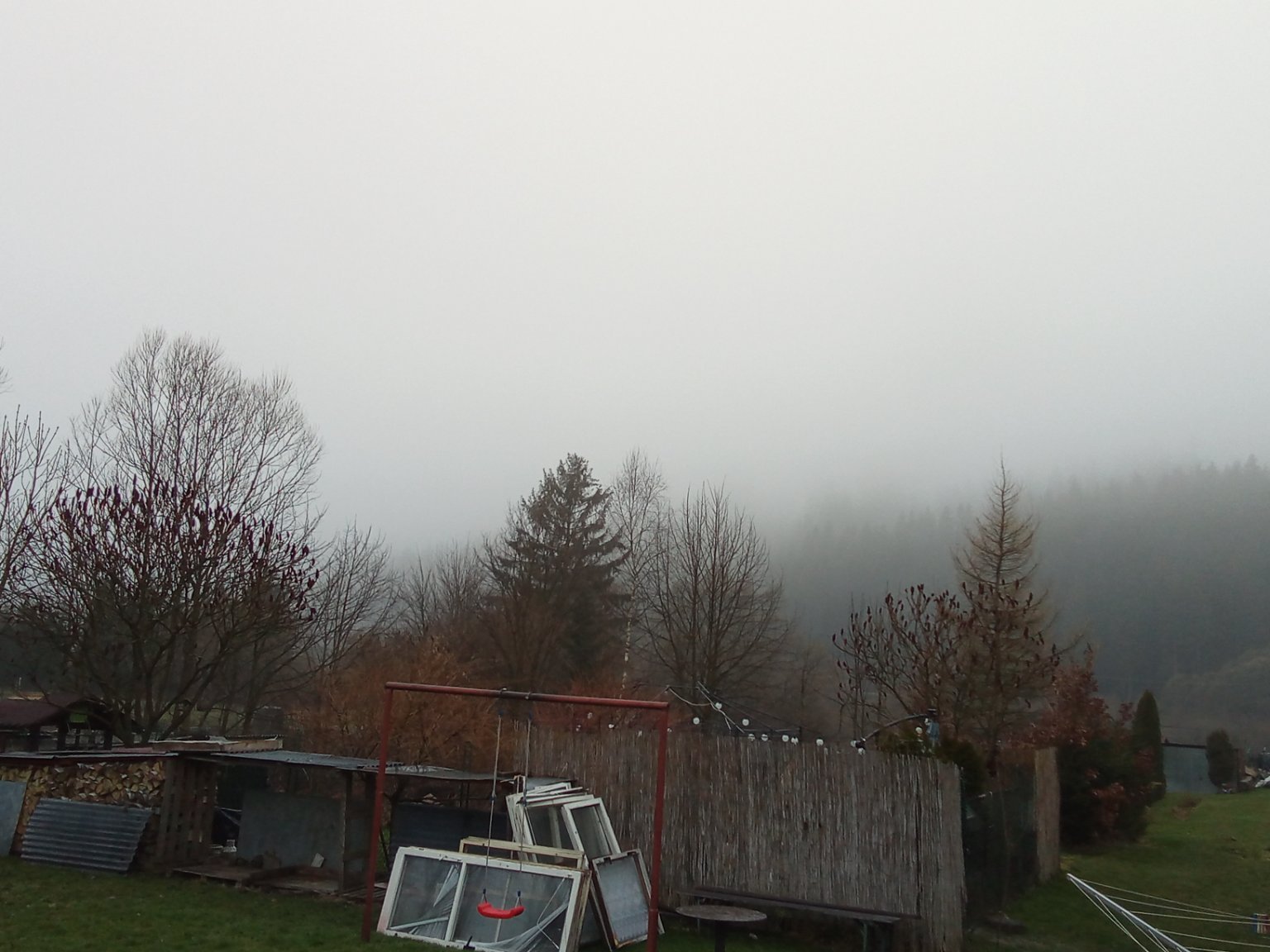 Včera krásně dnes mlha, mrholí, VSV vítr 5km/h,tlak 1012hpa,vlhkost 95%....