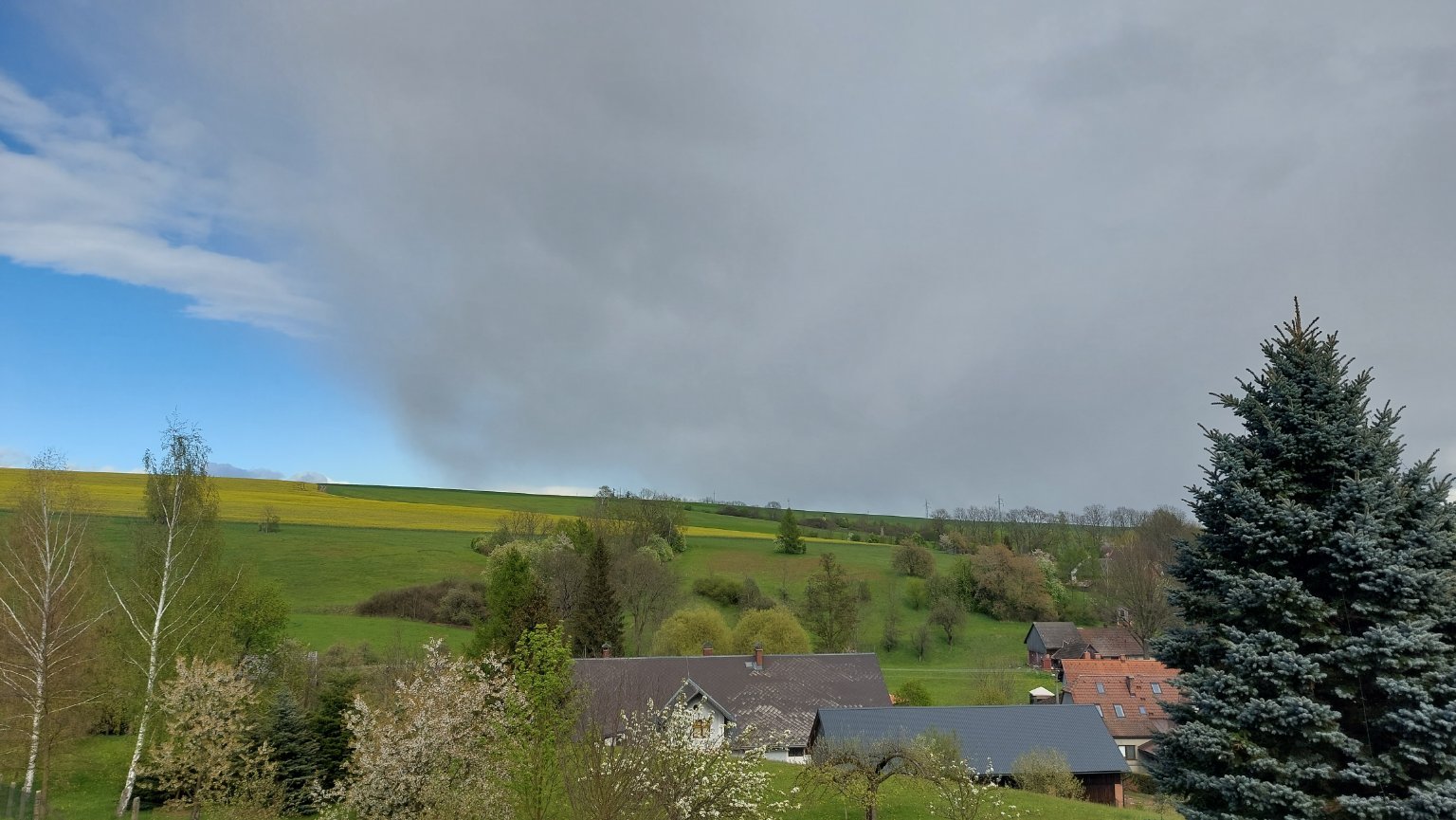 Vlhkost: 58%, Tlak 1014 hPa, pohled na vytvářející přeháňku, Vítr: 5.4 km/h (SV)