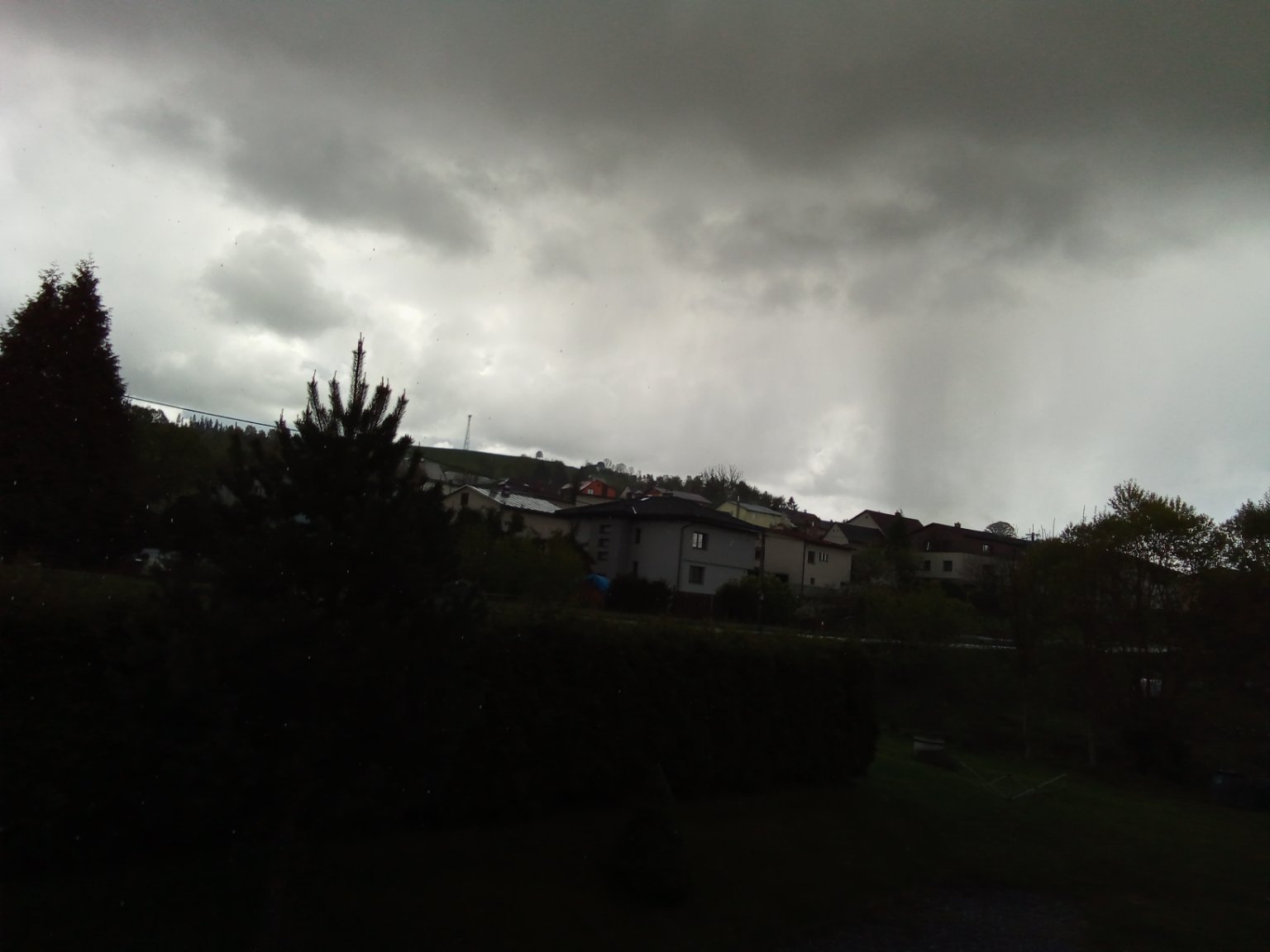 Proměnlivý slabý vítr, vlhkost 75%, min. 3,4°, tlak setrvalý, ráno srážky 5,8 mm, teď ale silné krupobití 1 cm velké kroupy.. do hodiny ve srážkoměru doufám roztají.. (9,8 mm zatím).