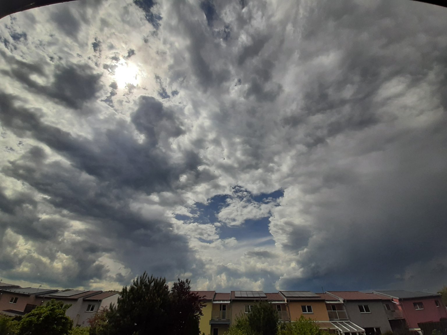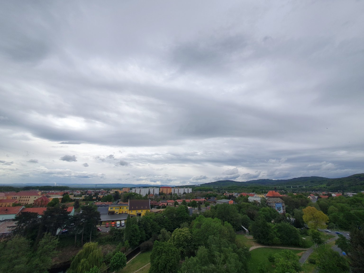 Mírný JV vítr, vlhkost 40%, min. 10,4°, tlak mírně klesá. Vše je zatím zelené. V dáli vznikající bouřka na východě Čech.