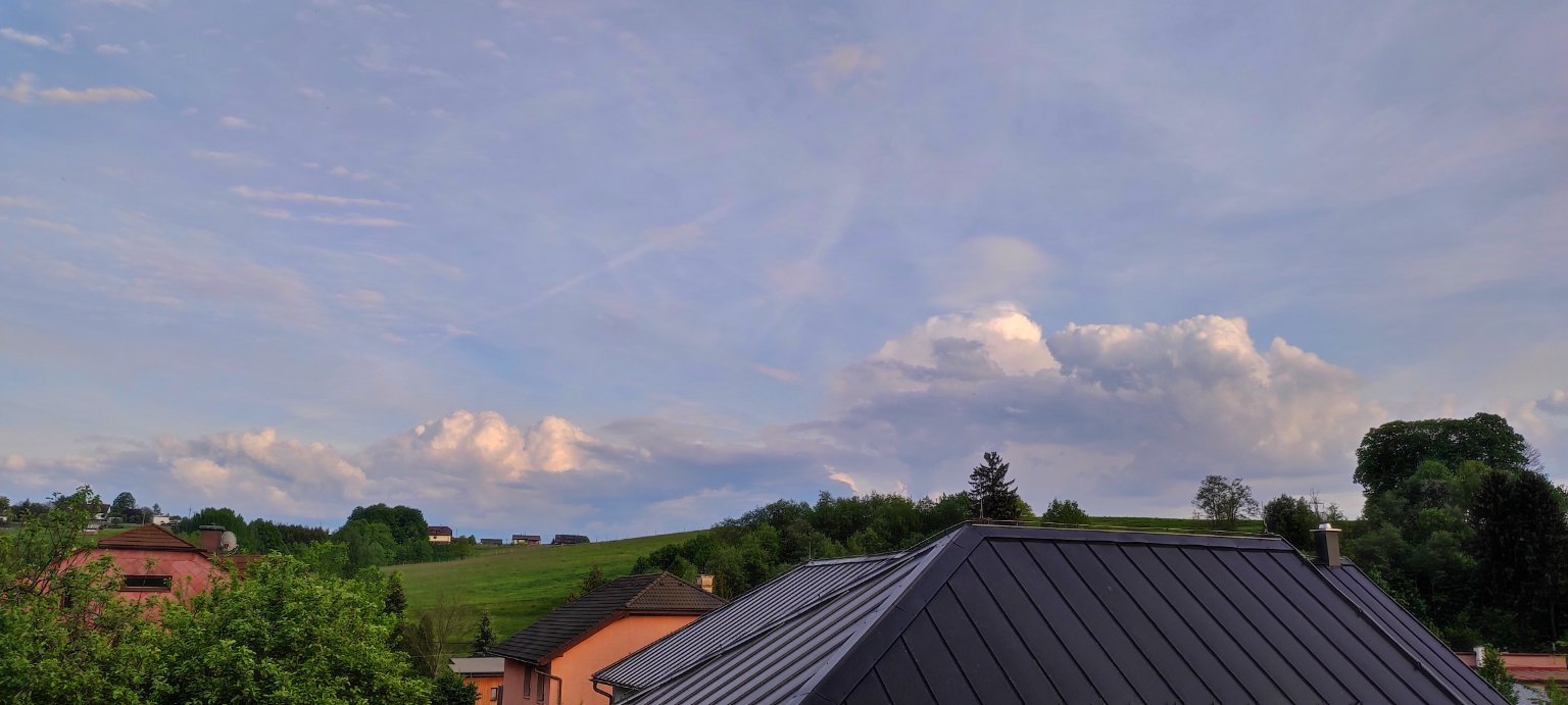 Aktuálně převažuje většinou skoro zataženo, bouřka v dálce, sem tam slabounký déšť a fouká většinou slabý větřík