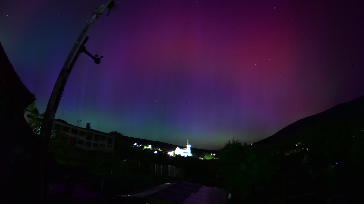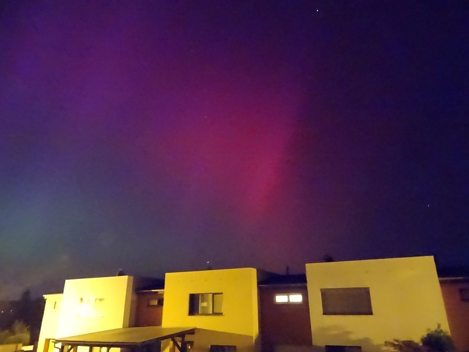 Neuvěřitelná polární záře, pokrývá téměř polovinu oblohy a je jasně vidět pouhým okem. Je tak i nezvyklé světlo. Polární záři lze dokonce pozorovat i přímo nad námi a nad jihozápadním obzorem. Oproti v našich zeměpisných šířkách "obvyklé" fialovo růžové má dnes i klasikou modrozelenou barvu. Vane slabý severozápadní vítr, tlak: 1021hPa.