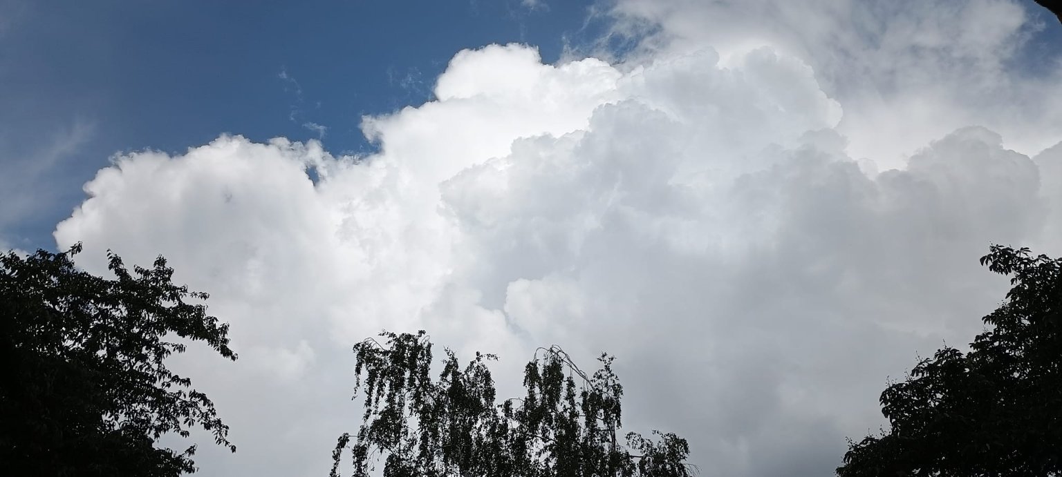 bouřka jede, viditelné blesky, dunění hromů, začíná slabě mrholit