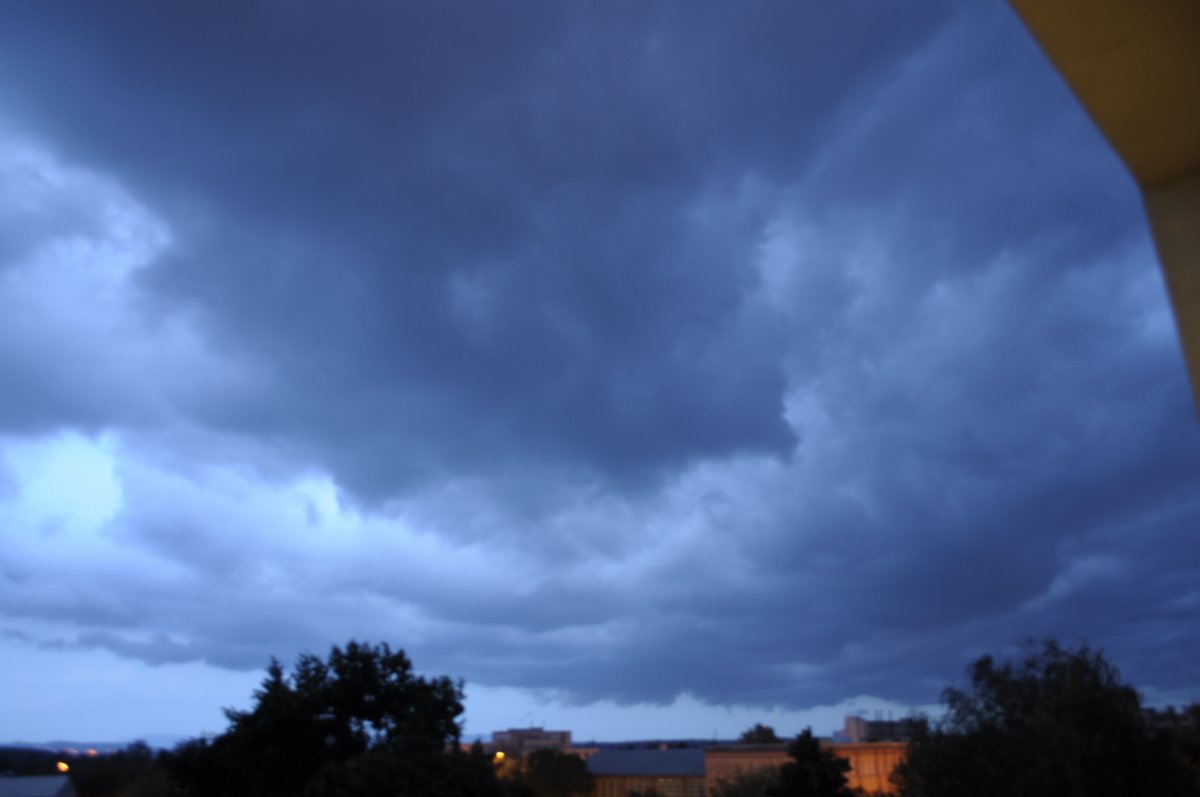 Bouřka s výrazným Shelf Cloudem, tlak 1006.1 hPa, vítr 3.4 m/s-JZ, vlhkost 87%.
