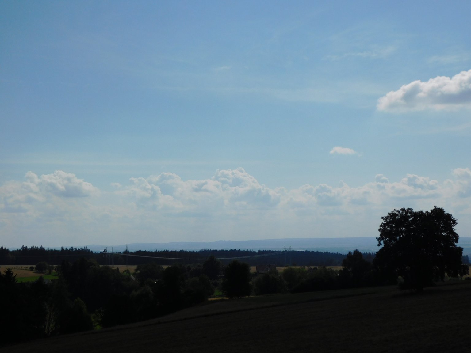 Polojasno, začalo kupit. V pozadí přeháňka s bouřkou, na rozhraní Karlovarska a Chomutovska. Vítr 1 m/s jižní. Vlhkost 50%
