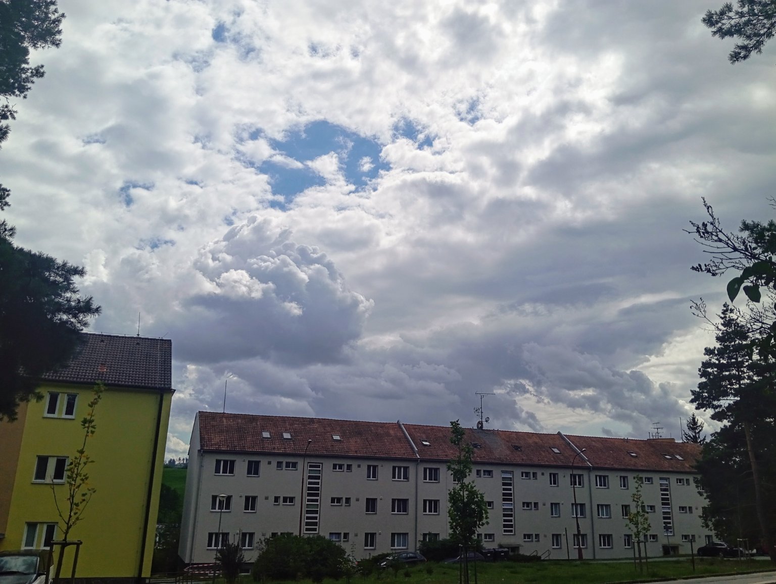 Aktuálně převažuje většinou skoro zataženo a mírná až silná dešťová přeháňka a a většinou slabý přechodně až mírný vítr