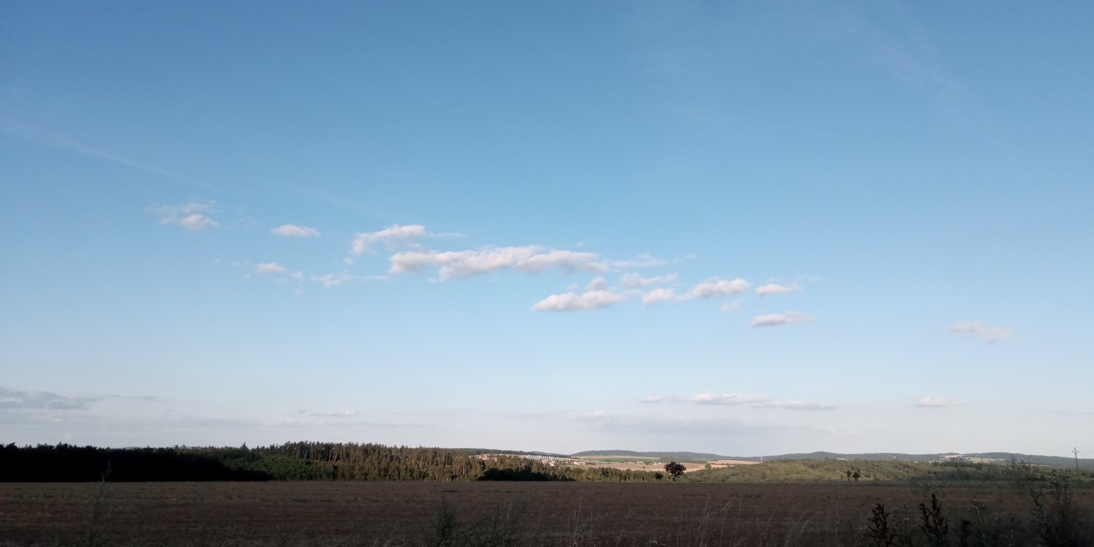 Skoro jasno. Vítr 1 m/s V. Vlhkost 51%. Max T dnes 25,2°C. Most-Vtelno max T 24,4°C