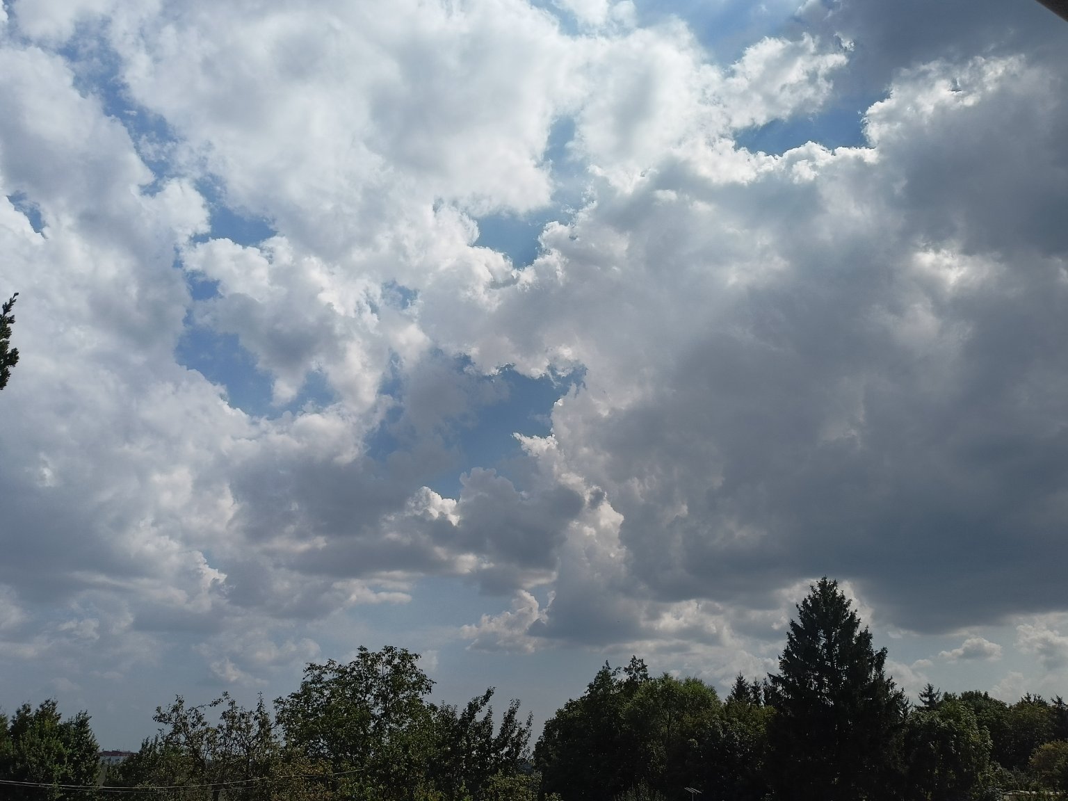 Před rozpadající se studenou frontou vrcholí příliv velmi teplého vzduchu. Na snímku je viditelná kupovitá oblačnost, která přináší zatím jen slabé přeháňky v Jeseníkách. Vane slabý západní vítr, tlak: 1014hPa.