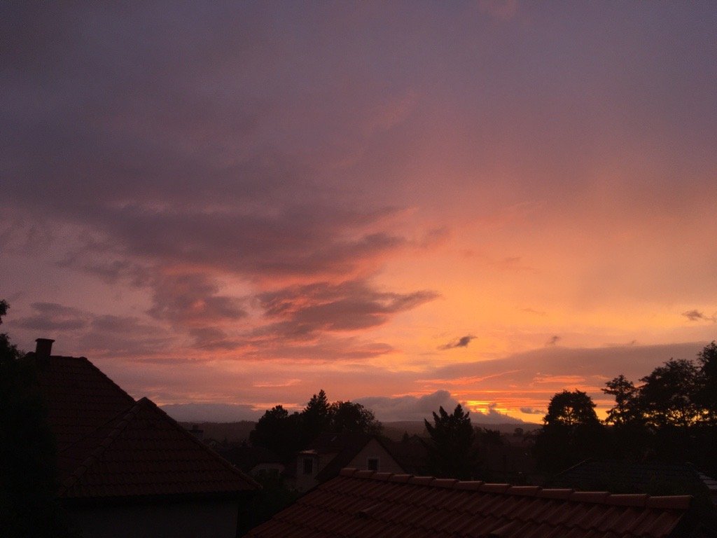 Večerní obloha, oblačno. Většinou bezvětří. Vlhkost 93%. Max T dnes 25,9°C, srážky neměřitelné. Most-Vtelno max T 25,6°C, srážky 0,3 mm