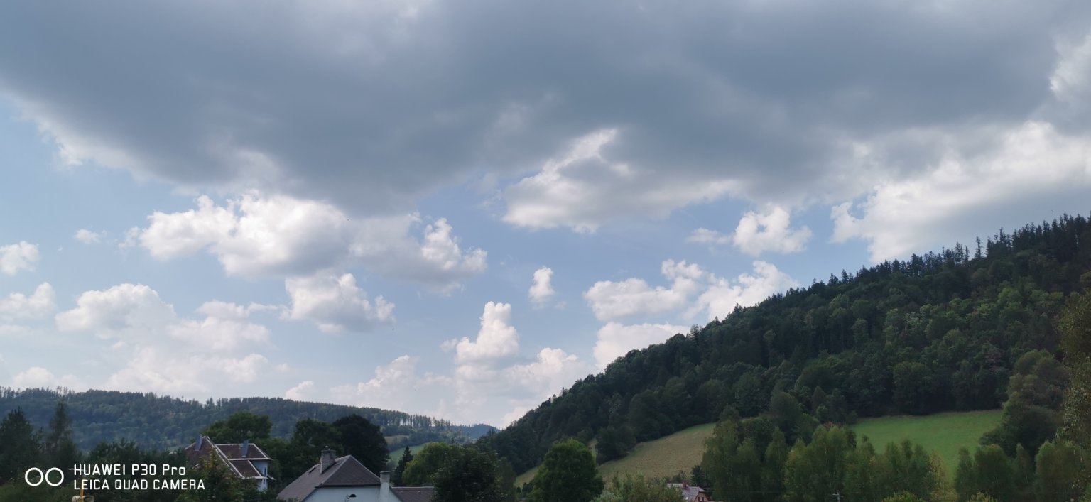skoro jasno, slabý až mírný vítr, 30°C