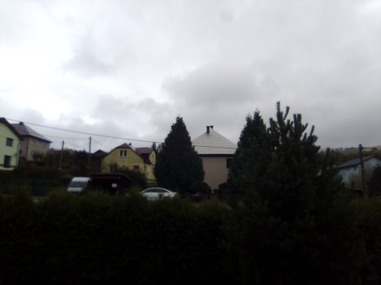 -°C, Zataženo. Okolní kopce jsou zahalené ve Stratech, dešť je jen občasný, teď zrovna neprši...