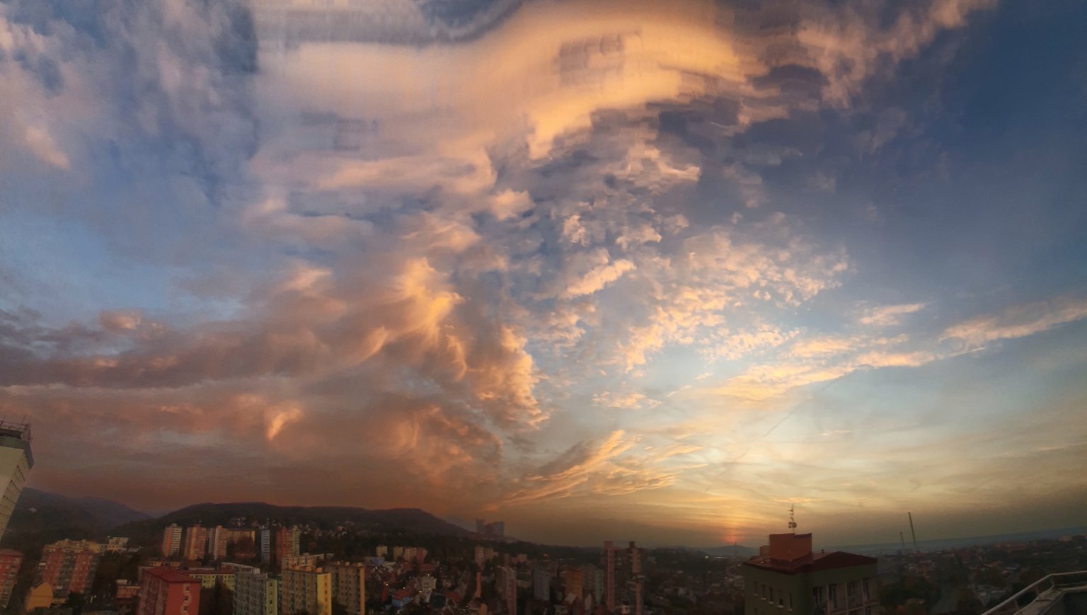 Chladné a mlhavé ráno; nad mlhou jasno, vánek