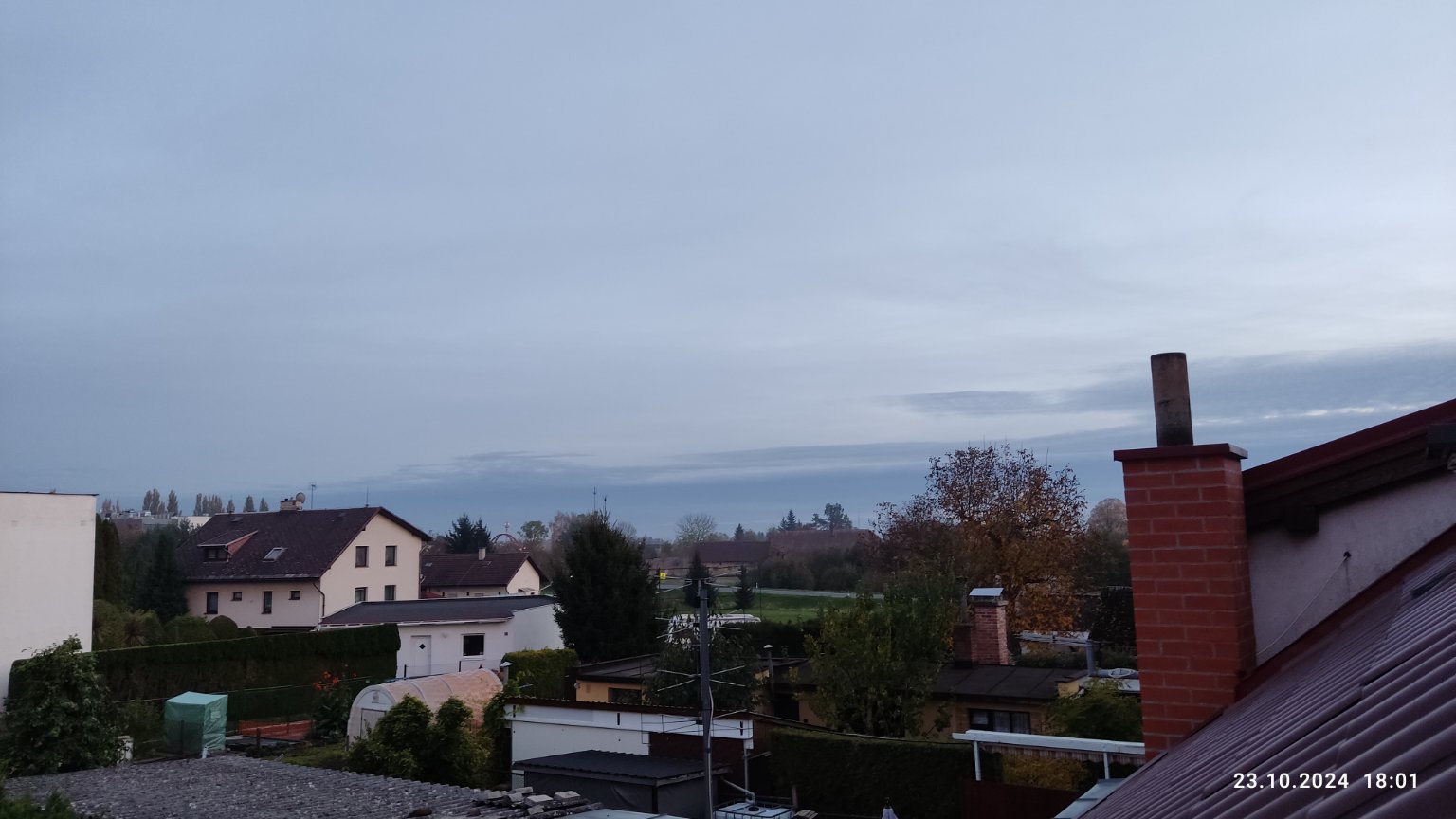 7,6°C, Polojasno, zanedbatelná mlha. Přizemni inverze.