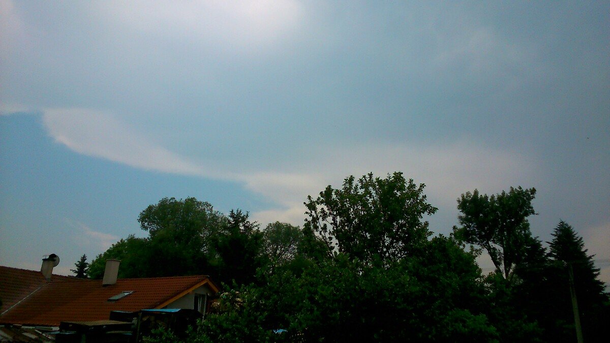 Právě se přes město přehnala bouřka, mírně poprchává tlak 1019,2 hPa, vlhkost 88 %