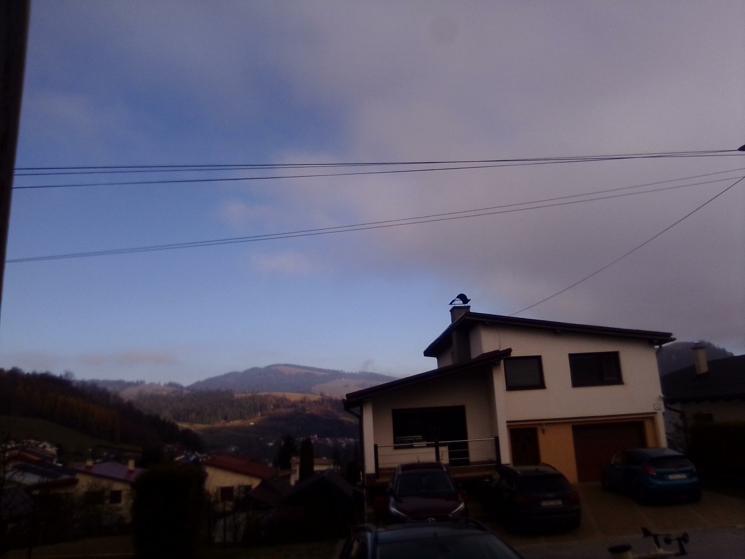 1,2°C, Jasno, Sníh: 0 cm. Je nadherně, čekam na ostatní žaky.