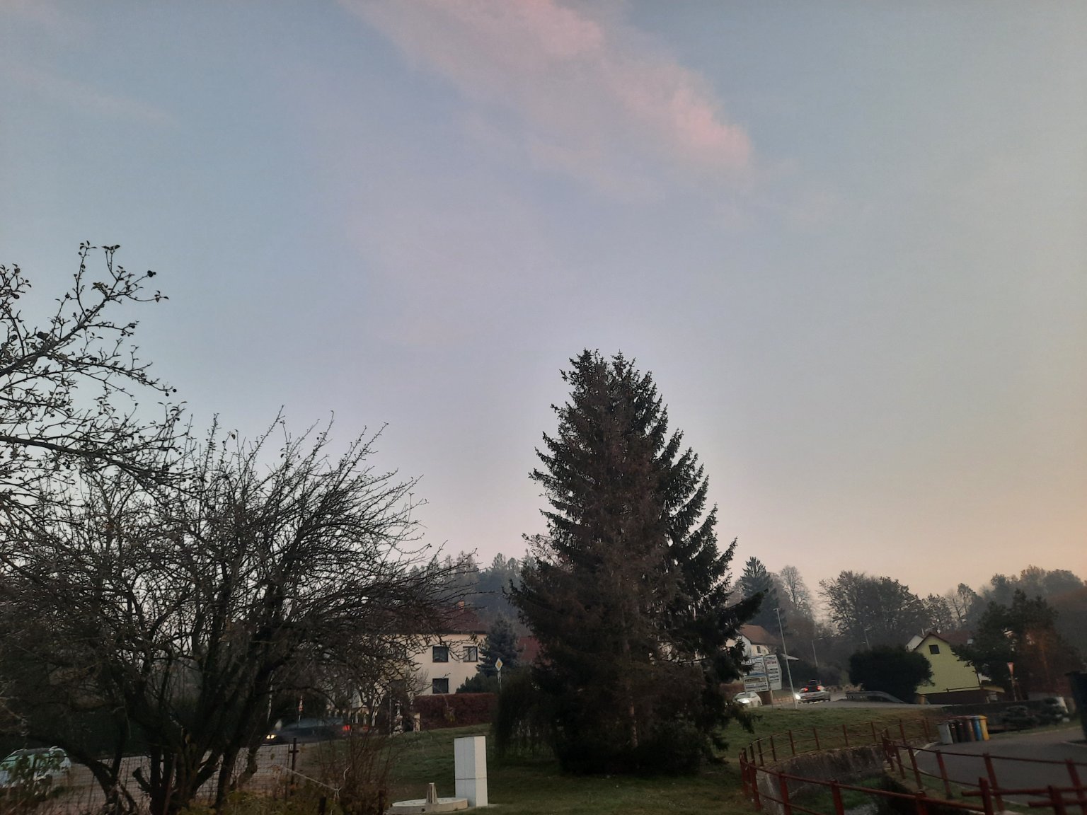-0,7°C, Mírná mlha, Sníh: 0 cm. Máme celkem výraznou mlhu, dohlednost je pod 100 m, Ale mobil to dost zkresluje a vypadá to, že je mlha jen slabá...