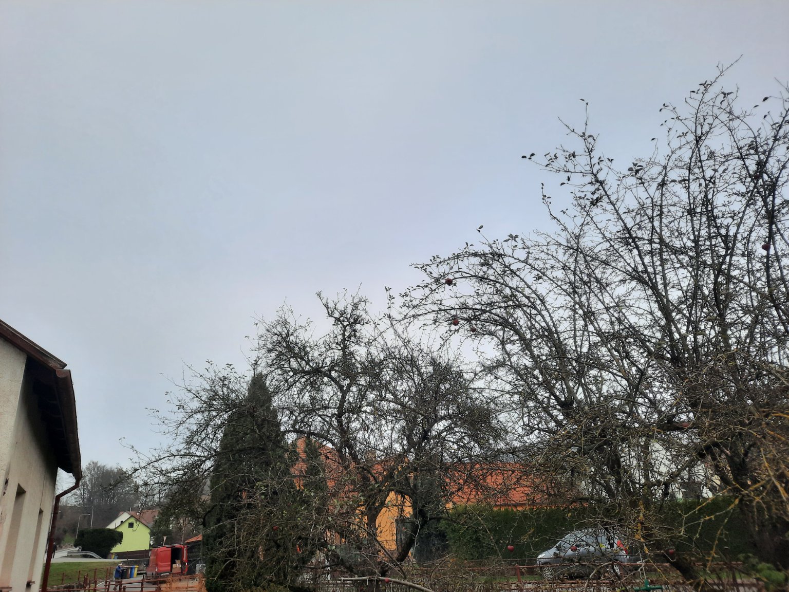 -0,4°C, Zataženo, Sníh: 0 cm. Vypadá to na 1. ledový den, bo maximum zatím bylo -0,2°C. Tma je jak ve 4 odpoledne...