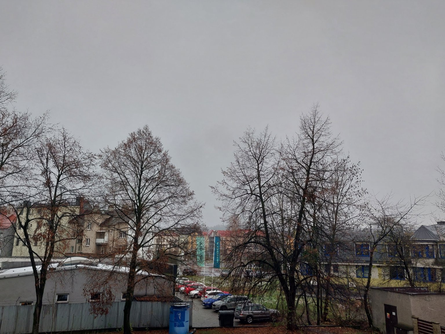 Oblačno, ojediněle polojasno, v dálce přeháňka, patrně deště se sněhem. Vlhkost 84%, tlak 998 hPa, mírný vítr.