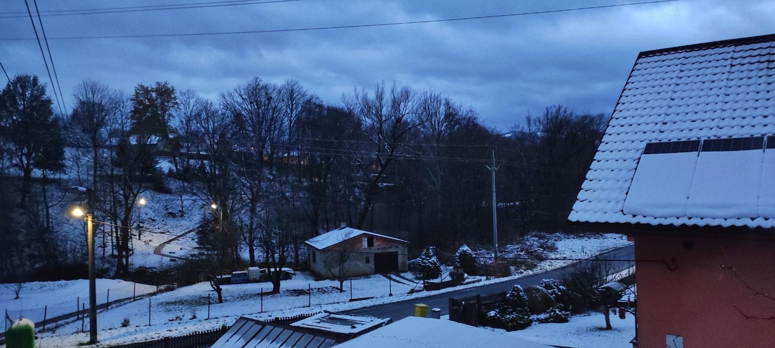 Aktuálně převažuje většinou převážně skoro jasno a fouká většinou slabý vítr, v noci napadnul konečně sníh