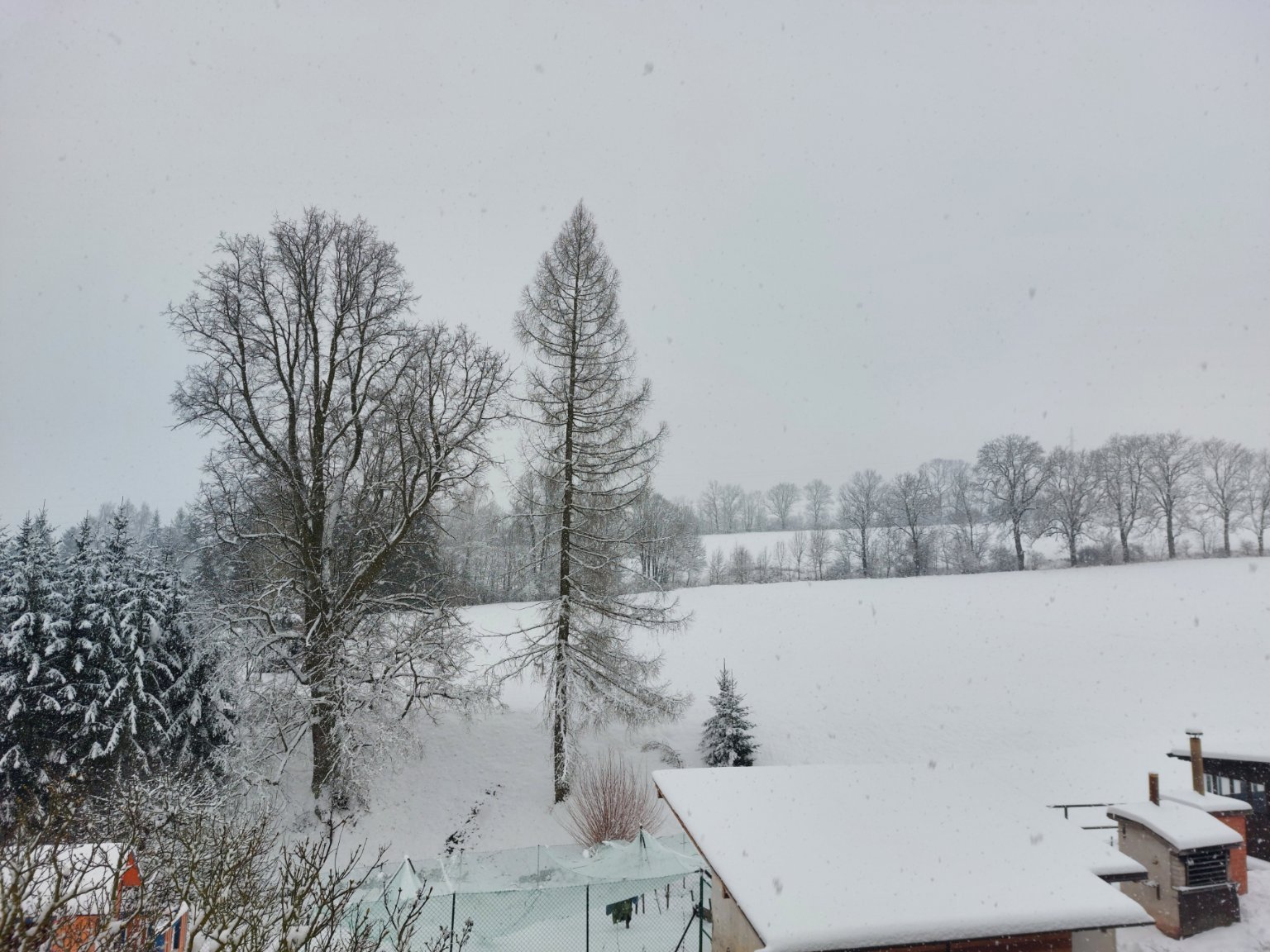 1,1°C, Silné až mírné sněženi, Sníh: nesouvislý. Krasně padají velké vločky.