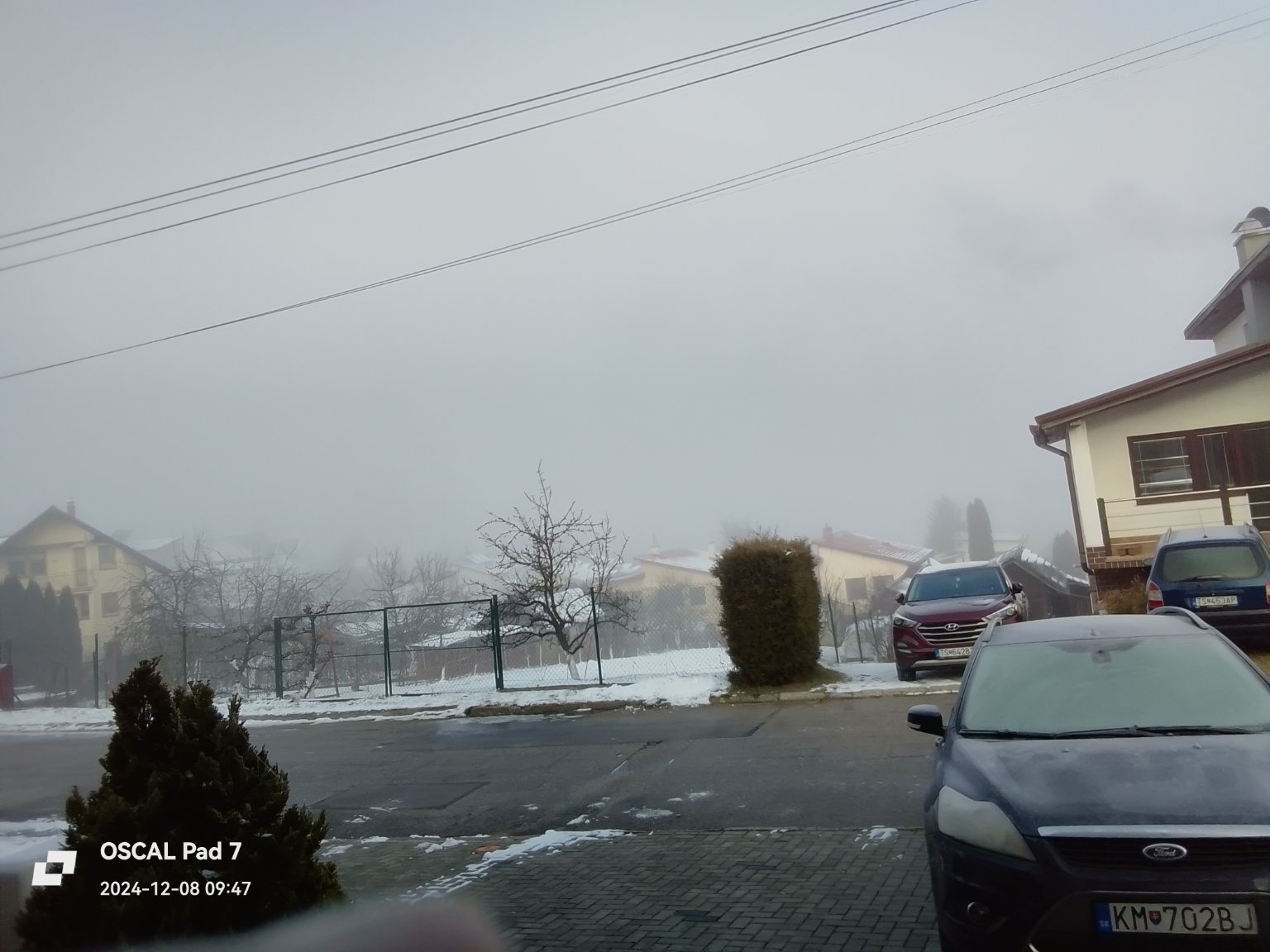Zataženo, mlhavo, občas velmi slabě mrholí. Vítr 1 m/s SSV. Min T dnes 2,9°C, srážky neměřitelné