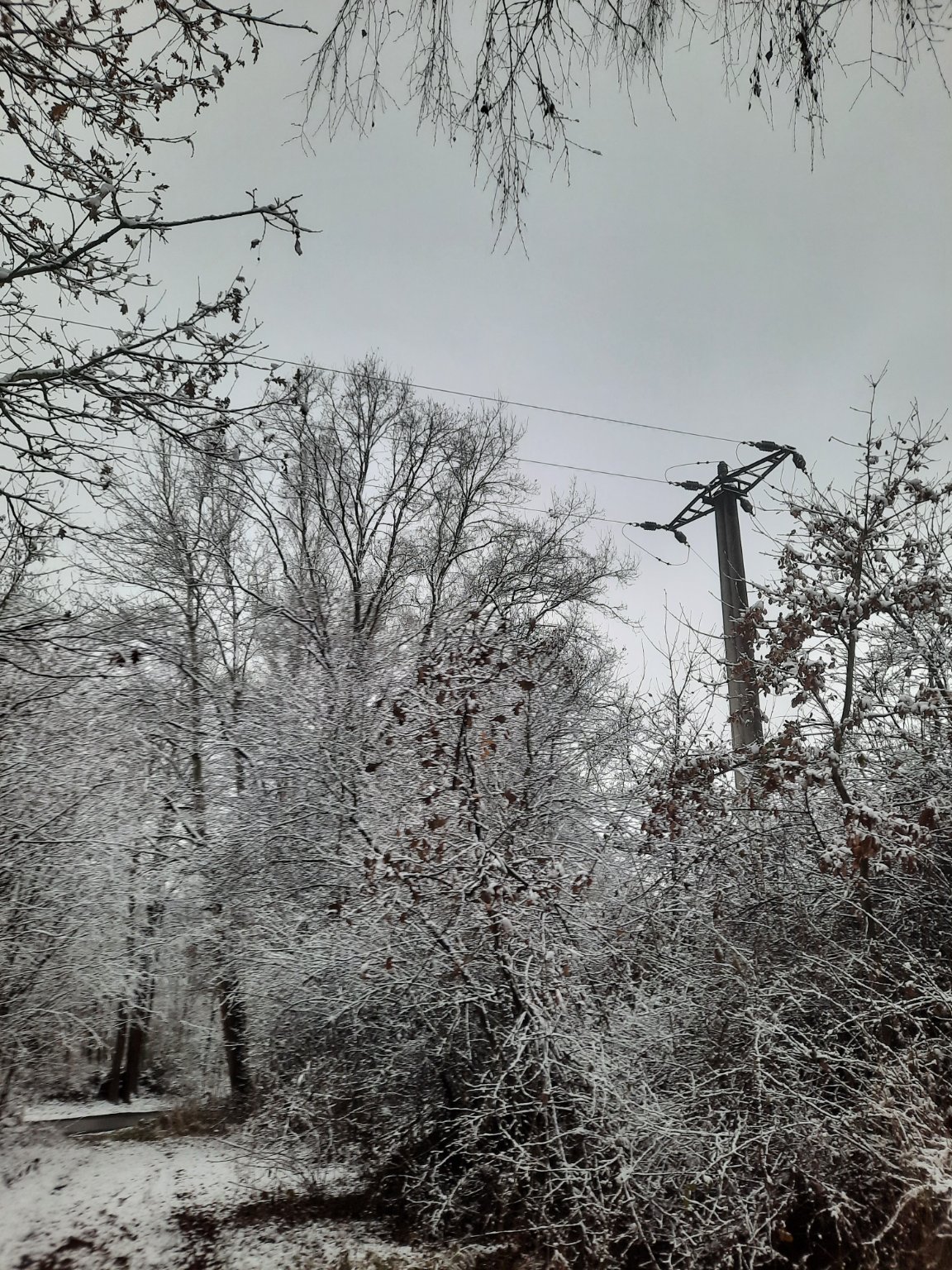 Slabý S vítr, zataženo a občas slabé ❄️. Hranice no. : 460 mnm. , mrazu 400 mnm. , sněhu 350 mnm. Leží až 2,5 cm mokrého ❄️. Nádherně! Další ledový den. Dnes 4,5 mm srážek. Foto 14:45.