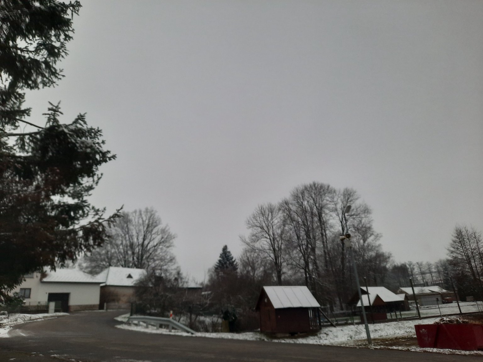 nad městem je sněhu celkem ještě dost, zataženo, -0.5°C