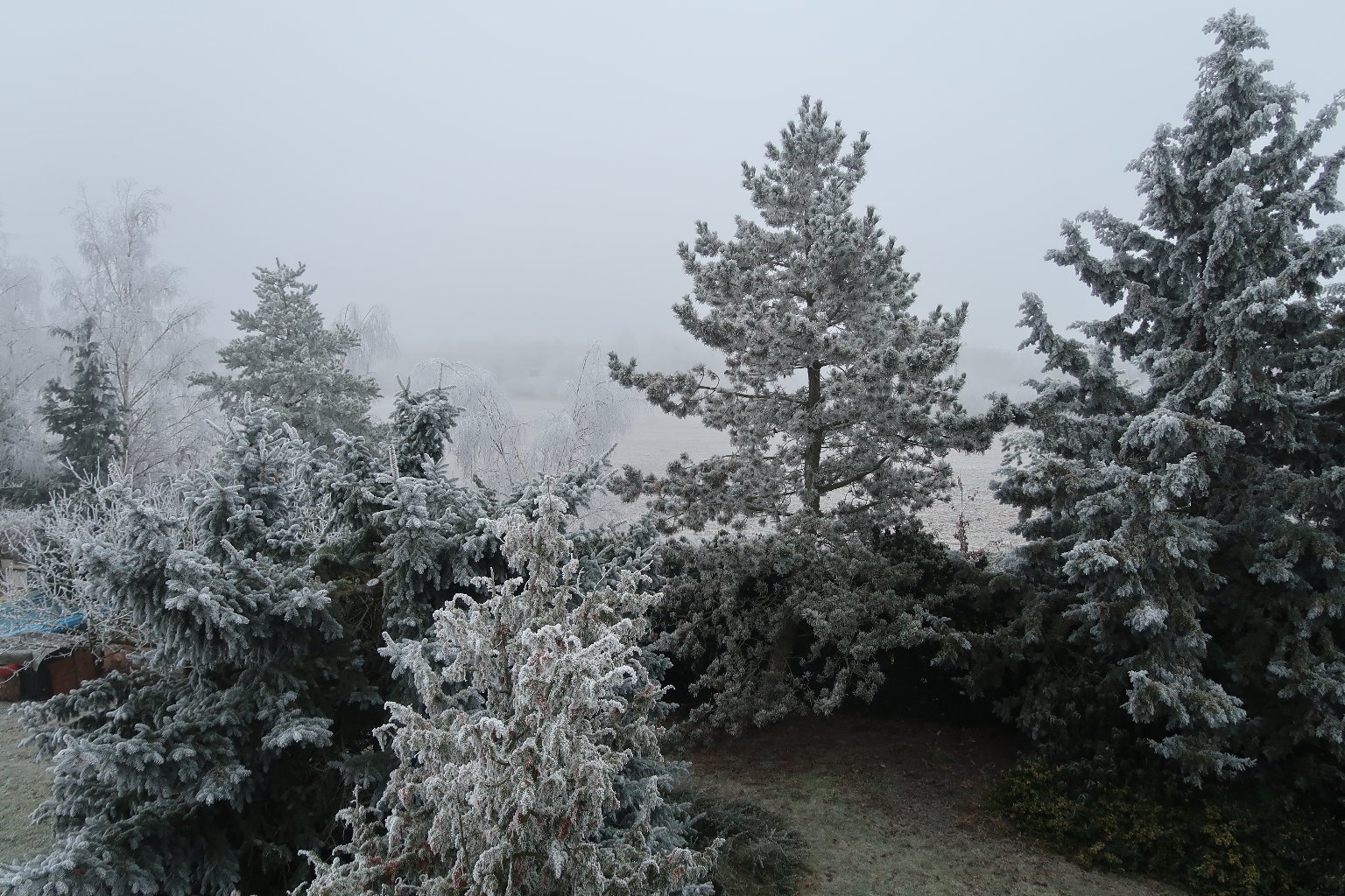 Stále zataženo nízkou oblačností, namrzající mlha, námraza a jíní. Velmi slabý vítr. Tlak 1029 hPa, vlhkost 80 %. Na vozovkách bez posypu námraza.