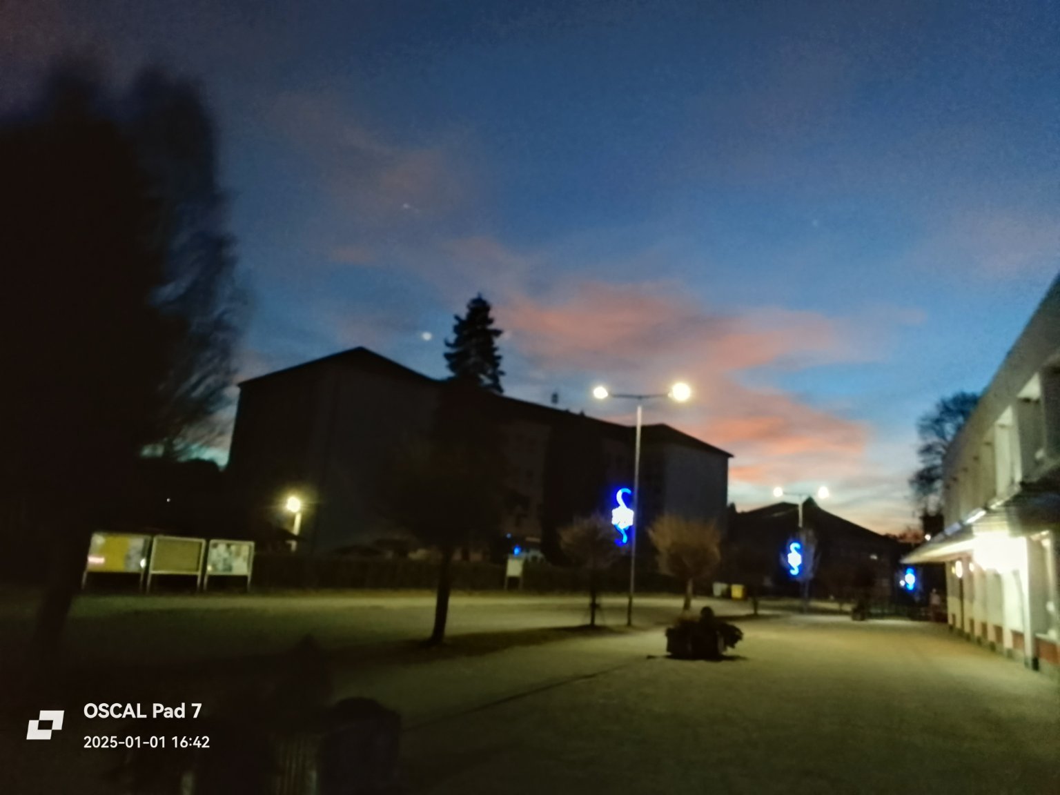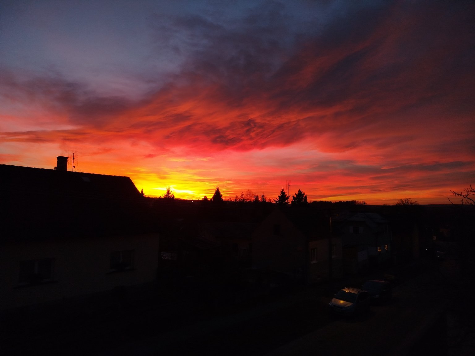 Červánky. Jinak většinou oblačno, vysoká oblačnost. Vítr 3-7 m/s s nárazy přes 10 m/s, jižní. Vlhkost 73%