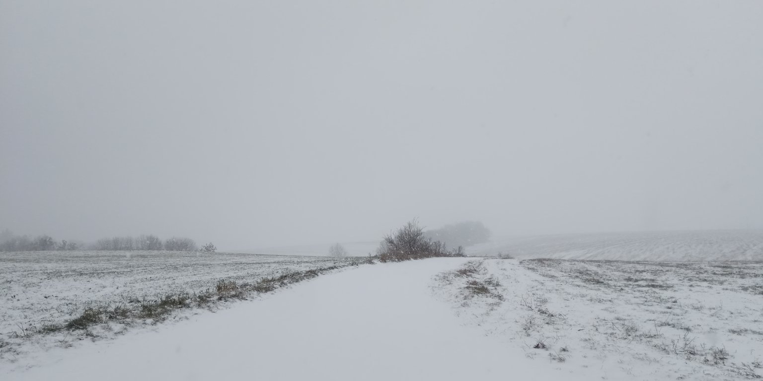 Drobné husté sněžení. Slabý vítr, tlak 1008 hPa.