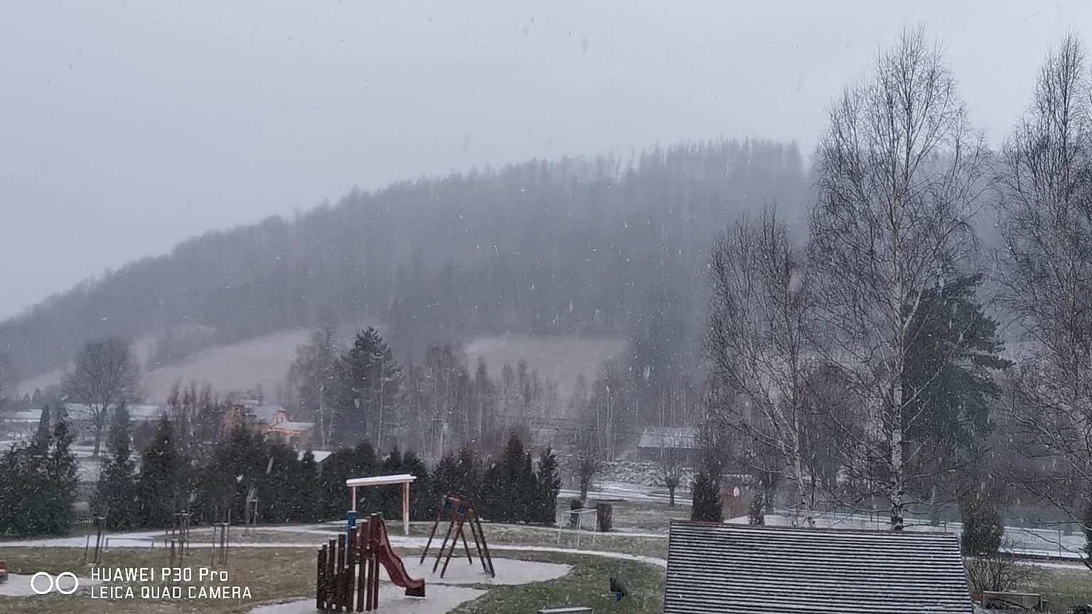 Čerstvý Z. vítr, sněhový poprašek a sem tam poletující sněhové vločky, tlak 1014 hPa.