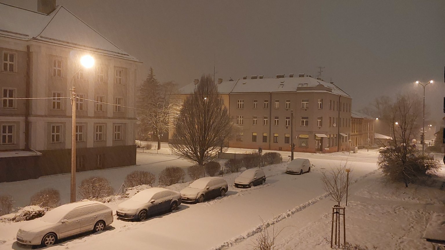 Ve 23:15 začalo sněžit, teplota byla -3°C, nejprve padaly velké vločky a asi po půl hodině, začaly padat menší vločky, ale sněžit začalo hustě.