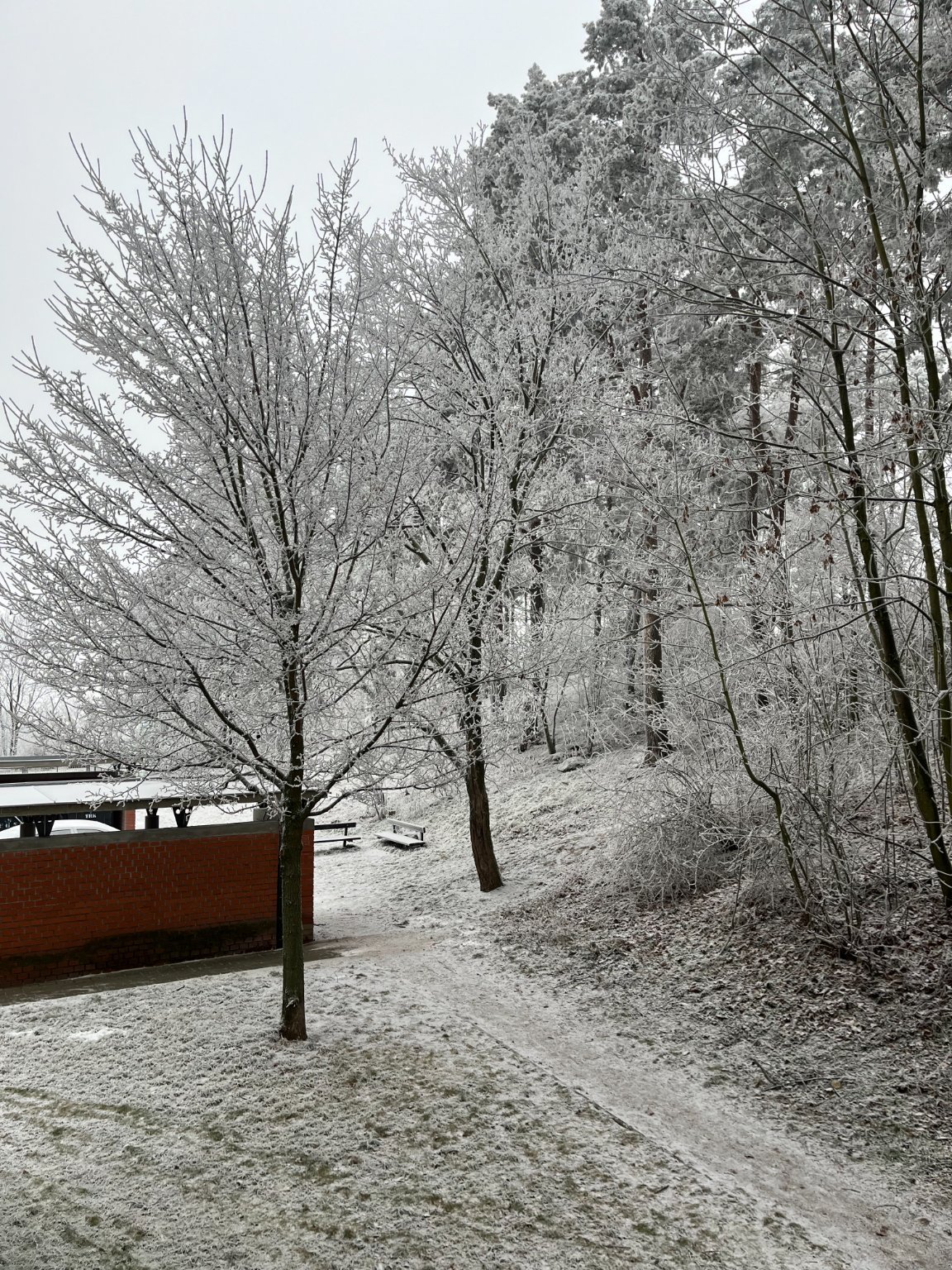 0,9°C, Zataženo, Sníh: 15 cm. Už tu zakopali nové sloupy, opakuje se přesně to co před rokem a půl v letě.