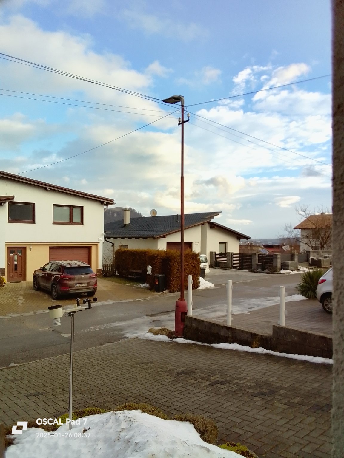 7,3°C, Zataženo, Sníh: nesouvislý. Venku je žluto, většinou to tak při oblevách bývá.
