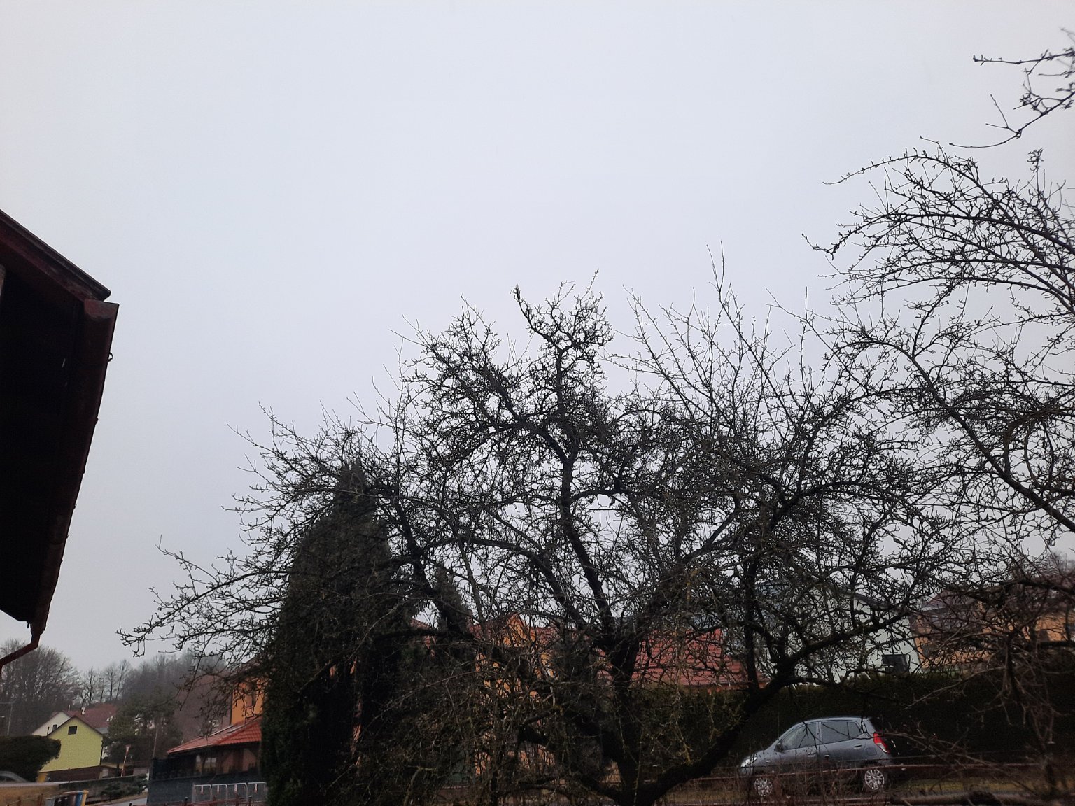 Slabé mrholení, velmi slabý vítr východních směrů, tlak 1004 hPa - stoupá, vlhkost 90%.