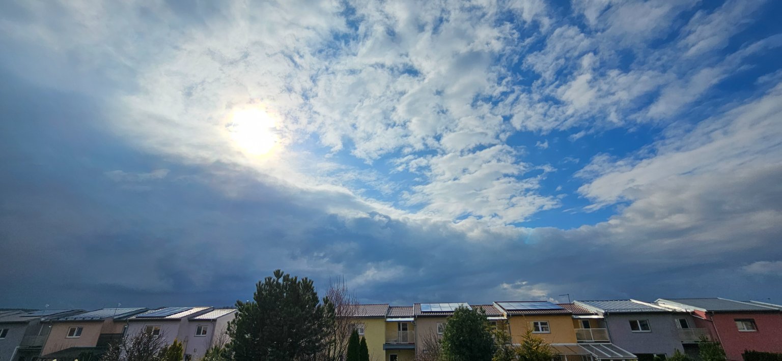 Slabá přeháňka deště s menšími kroupami, čerstvý SZ vítr s nárazy přes 50 km/h, skoro zataženo a chladno