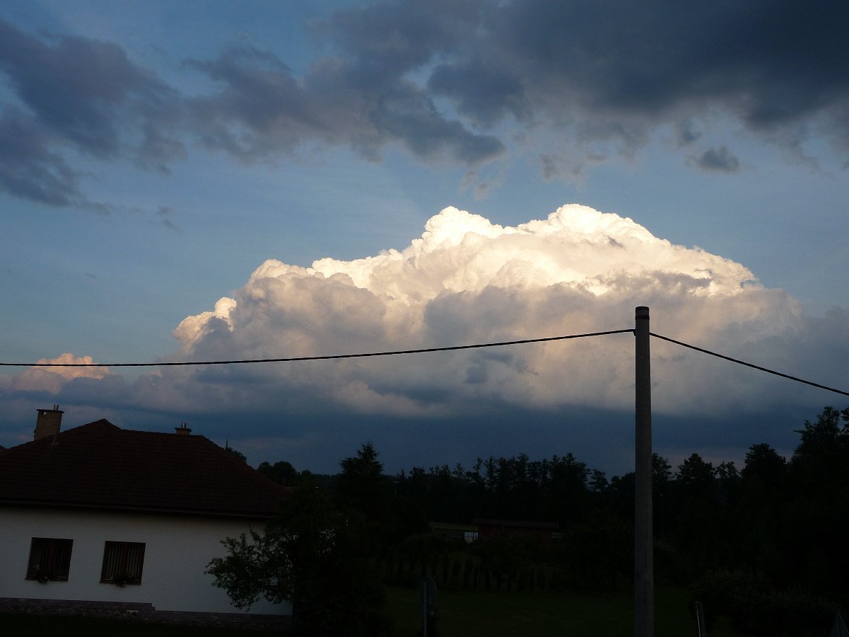 vysoká a trochu střední oblačnost směrem na SZ , směr k JV v dálce věžové kongesty (jak ukazuje obrázek - ty kopce pod těmi mraky při obzoru je 70 km vzdálená Českomoravská Vysočina) , klidno a klesající tlak - akt. 1011,4 hPa / dnes byl po delší době letní den s max.teplotou 26,5 st .