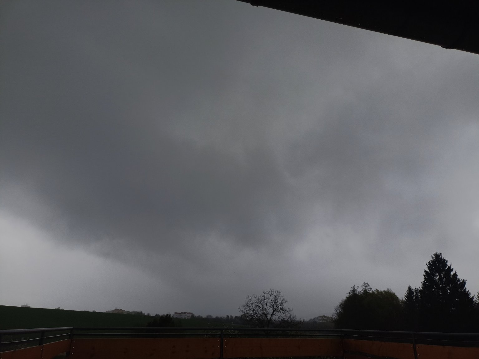 Skoro zataženo. Vydatnější dešťová přeháňka. Mírný JV. vítr, tlak 1008 hPa.