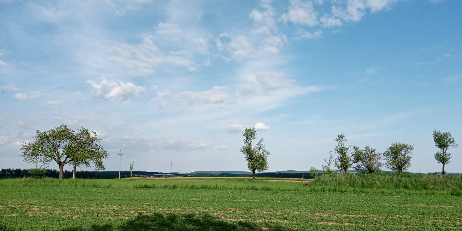 Krásný slunečný den. Vane jen slabý proměnlivý vítr, tlak: 1021hPa. Ráno však bylo s minimem 3,8°C ještě chladné. Snímek zachycuje pohled z dronu směrem na Olomouc.