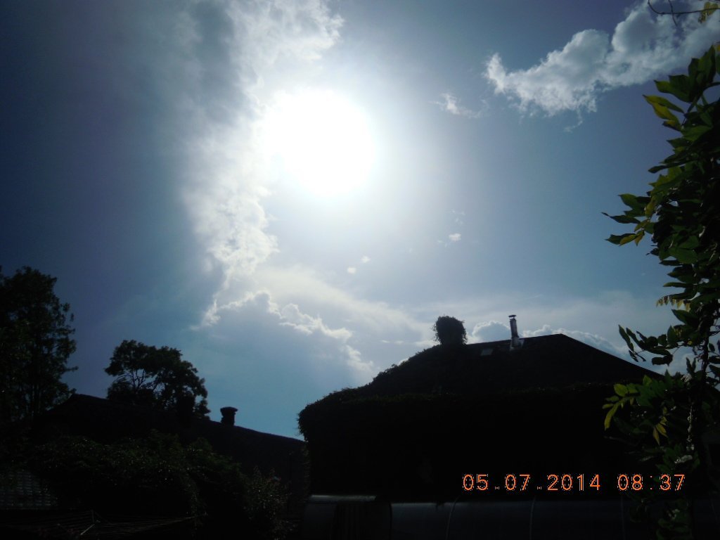 foto z 2014 07 06 v 08:14 zachycuje bílé mraky - od východu se nasouvají trochu tmavší - po 5 hodině bylo slyšet pořádný slejvák - nyní je venku příjemně a dobře zalito - více vody dnes nepotřebujeme