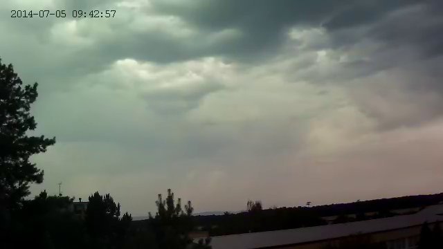 Zataženo, mírné dešťové přeháňky. JV vítr do 10 km\h, tlak 1011,8 hPa a vlhkost 52 %.