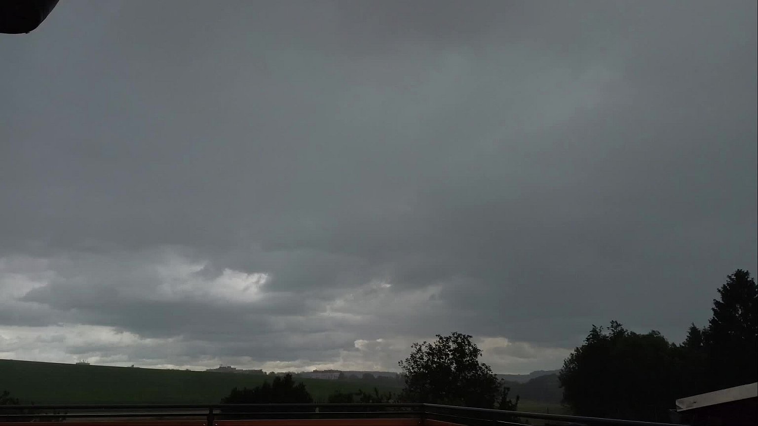 Silný déšť, snad přeháňka, slabý Z. vítr, tlak 1014 hPa.