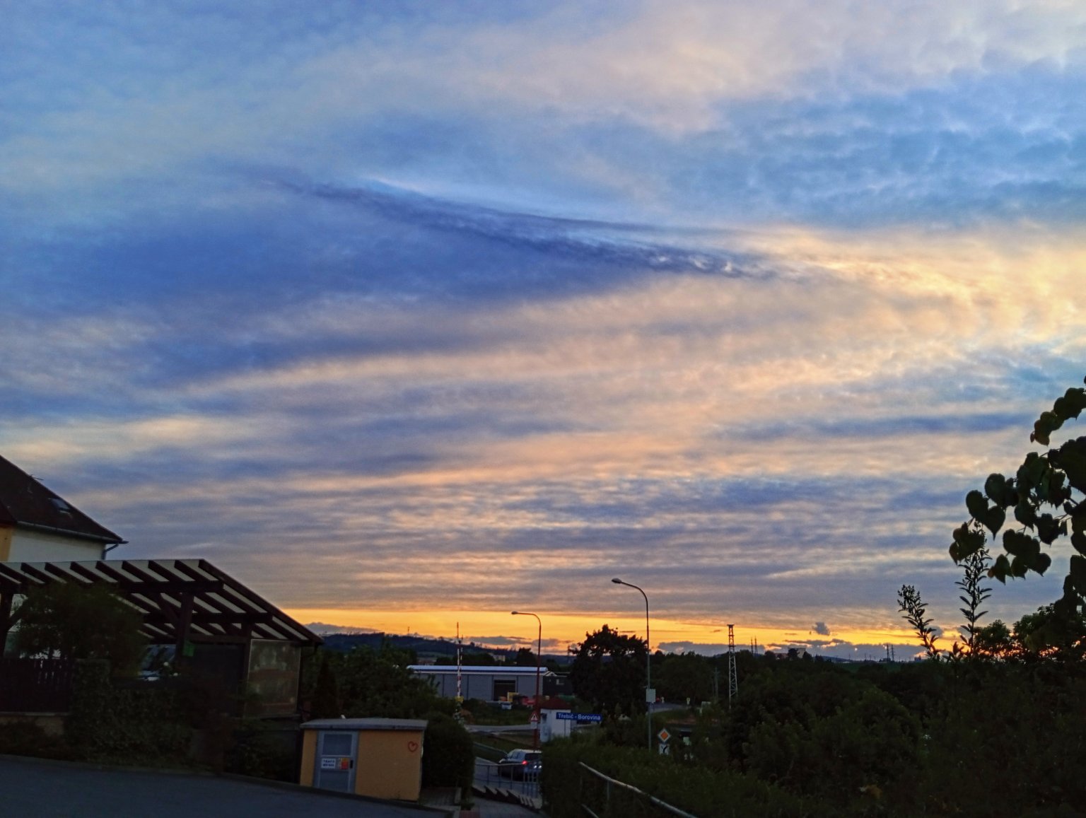 Aktuálně převažuje většinou skoro zataženo až oblačno altocomulus a fouká většinou vánek až slabý větřík
