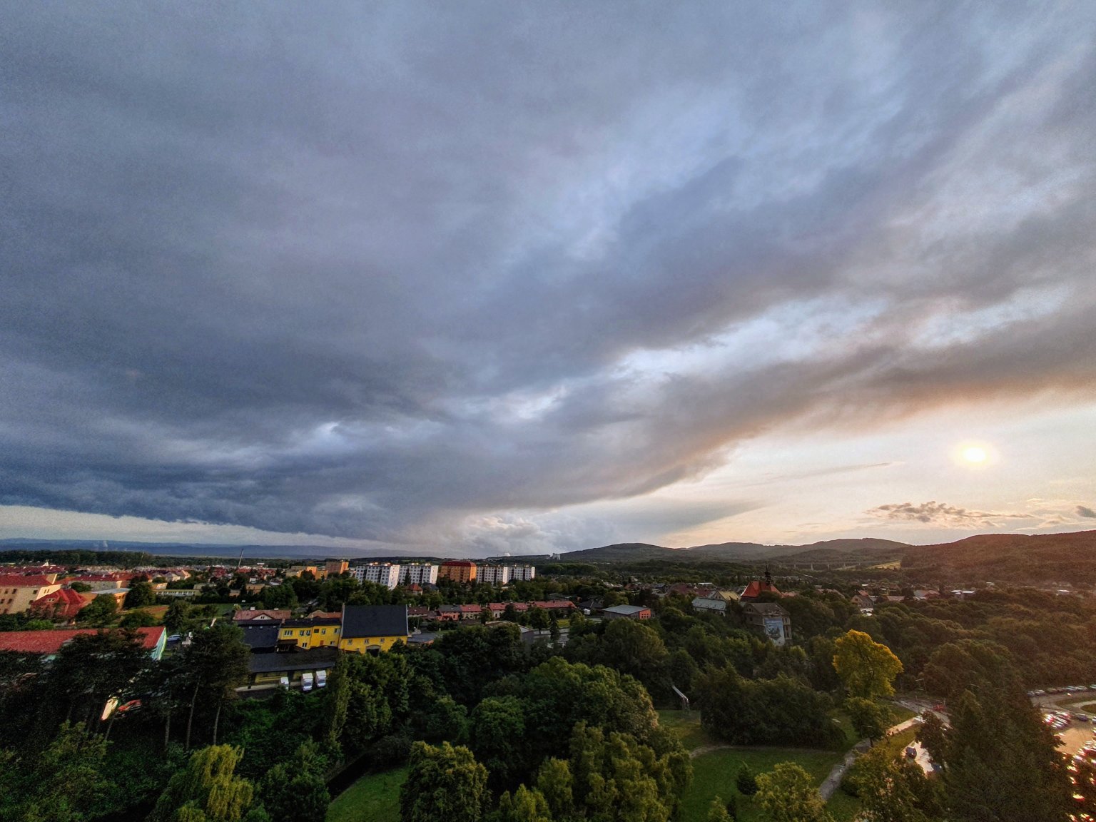 Od západu se žene další dešťové pásmo. Projevuje se to hezkou strukturou mraků. Vypadá to ale, že nás to buď mine severně nebo se dotkneme jenom spodní část pásma.