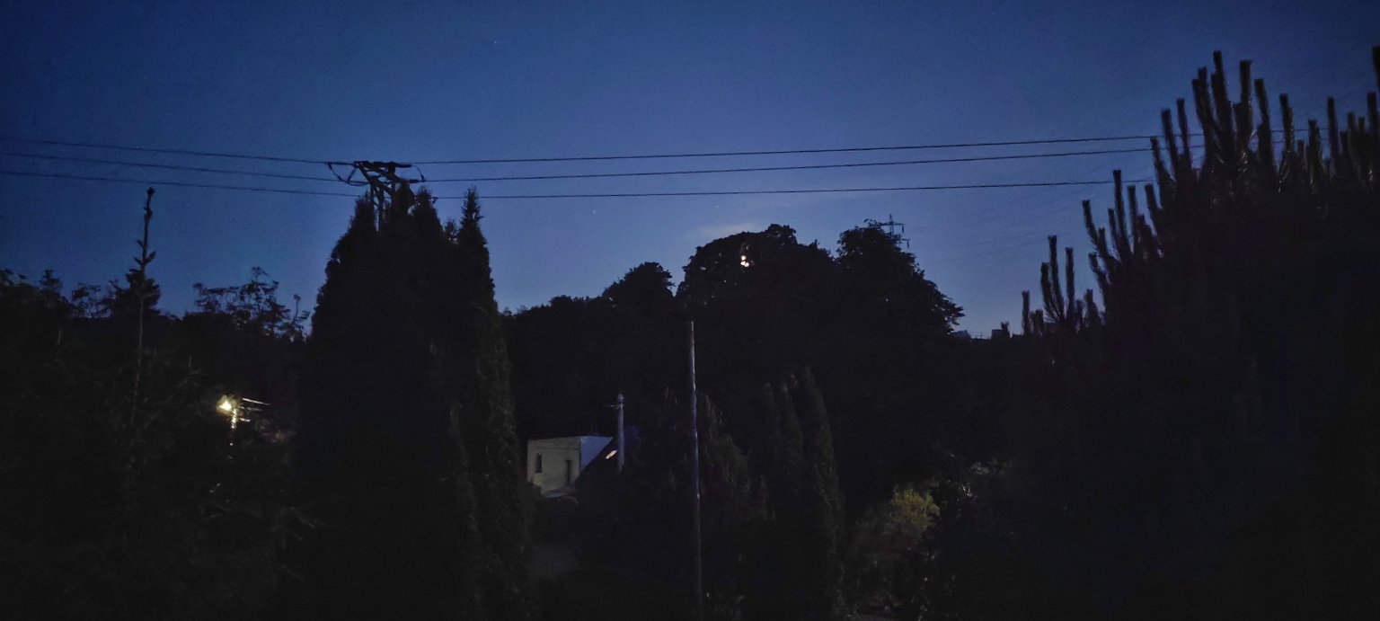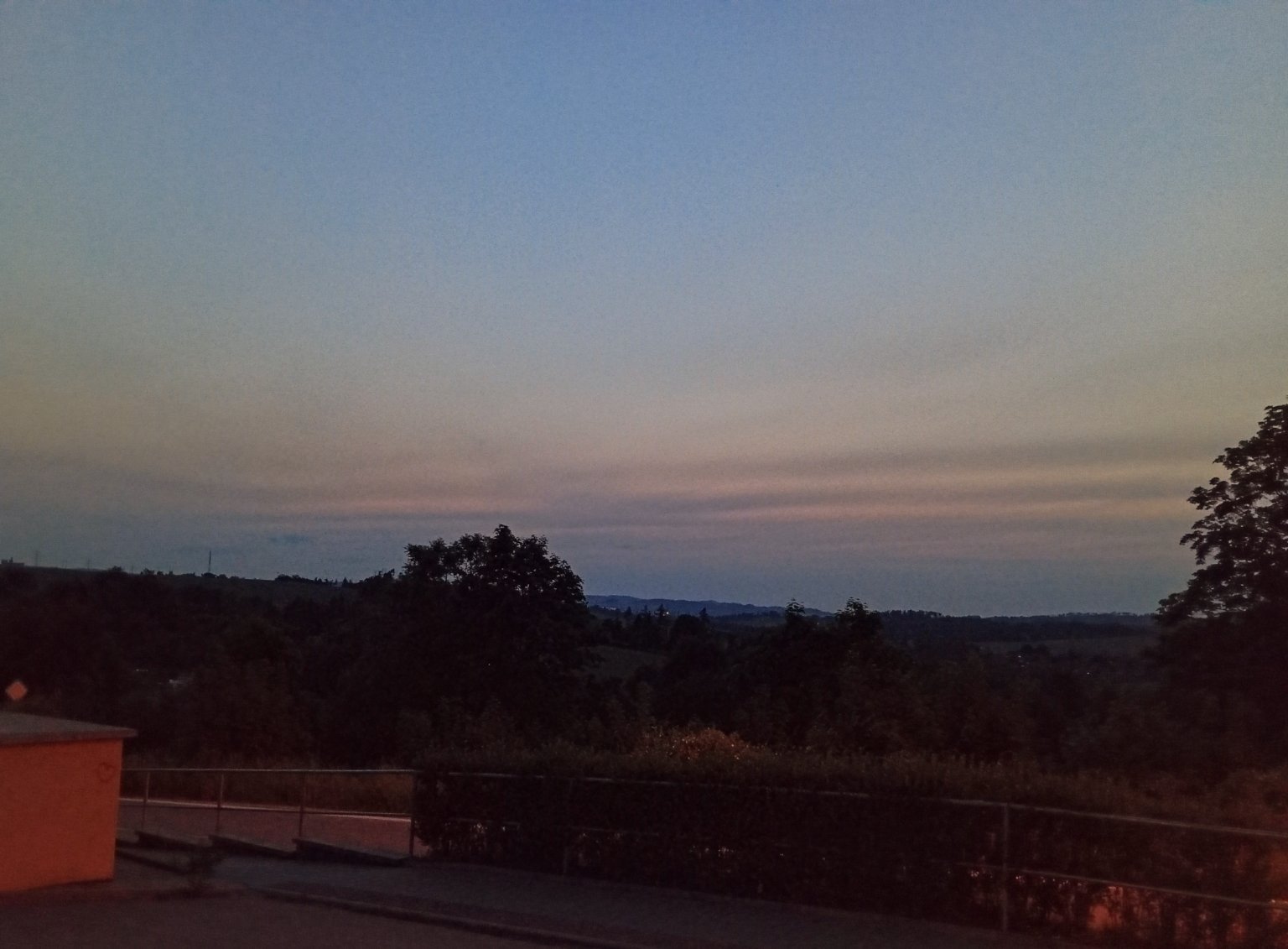 Skoro jasno, místy ještě vysoká oblačnost. V dálce jsou opět vidět nějaké mraky. Celkem už se ochlazuje. Na ráno to tam ukazuje jenom 7 stupňů, tak uvidíme.